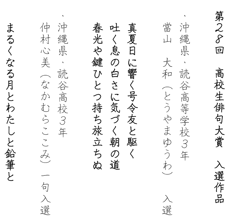2025年12月15日 12:00神奈川大学が主催する「第28回 全国高校生俳句大賞」にて、當山大和さん(3-5)が『入選』、仲村心美さん(3-8)が『一句入選』しました。1万通以上の応募があった中での入選です。おめでとうございます!!
